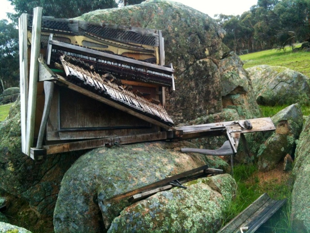 In the middle of a paddock, a baby grand piano was positioned precariously on a rocky hill. All his varnish had fallen away to reveal a weathered, tired skeleton. The ivory façade of his keys was also long gone. Dilapidated state irrelevant, he still stood magnificent and commanding.